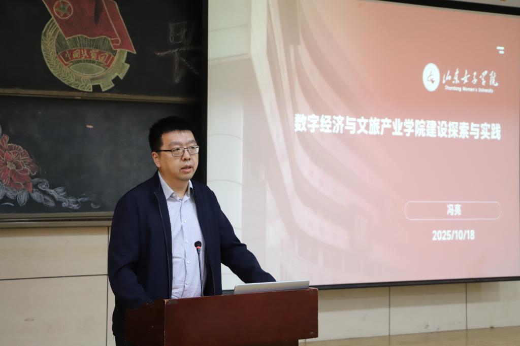 山东女子学院经济学院副院长冯亮则聚焦数字经济与文旅产业的融合发展,作了《数字经济与文旅产业学院建设探索与实践》的主题报告,他介绍了山东女子学院在数字经济与文旅产业学院建设过程中的具体举措、建设成果,分享了专精特新企业数字化网络化智能化赋能项目等3 个数字经济发展典型案例。这些案例不仅展现了数字经济在文旅产业中的创新应用,更为工商管理系数智商贸人才培养方案的优化、学生就业竞争力的提升拓宽了思路。