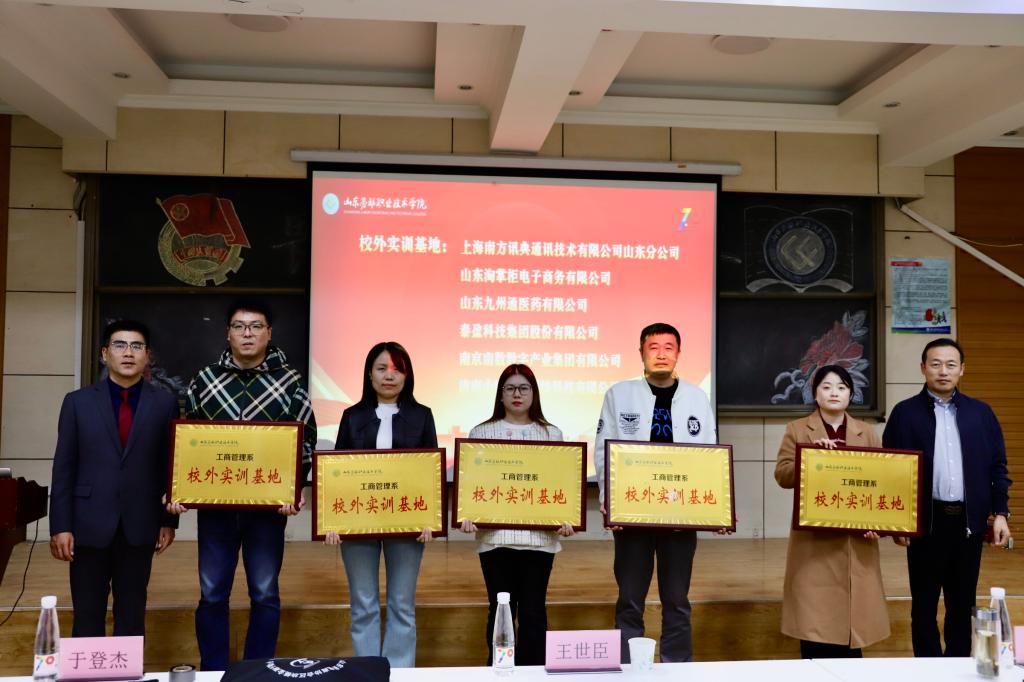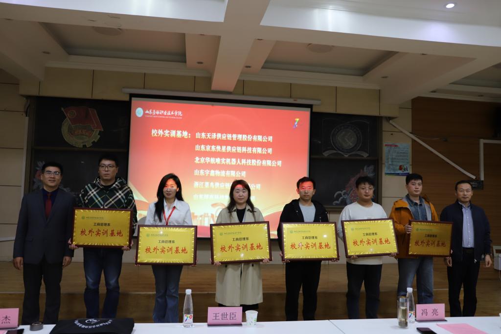 进一步深化校企合作,推动产教融合向实处走、向深处走,研讨会上举行了隆重的校外实训基地牌匾颁发仪式。工商管理系为山东天泽供应链管理股份有限公司、上海南方讯典通信技术有限公司山东分公司、山东京东快星供应链科技有限公司、北京华航唯实机器人科技股份有限公司、山东宇鑫物流有限公司、浙江菜鸟供应链管理有限公司山东分公司、山东淘掌柜电子商务有限公司、山东九州通医药有限公司、泰盈科技集团股份有限公司、世纪开元智印互联科技集团股份有限公司、济南小糖硕果网络科技有限公司等企业正式颁发校外实训基地牌匾。双方将以此为契机,在人才培养、实践教学、实习就业、技术研发等方面开展更加紧密的合作,充分发挥企业在实践教学中的优势,为学生提供更多高质量的实践岗位与实训机会,助力学生将理论知识转化为实际操作能力,培养更多适应数智商贸与供应链行业需求的优秀专业人才。
