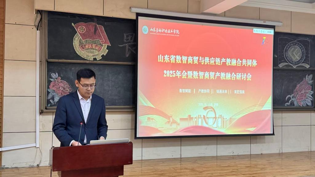 在学院隆重庆祝70 周年校庆的重要时刻,10 月 18 日,工商管理系精心组织举办了 “山东省数智商贸与供应链产教融合共同体 2025 年会暨数智商贸产教融合研讨会”。此次研讨不仅是对学院校庆的有力献礼,更是推动数智商贸与供应链领域产教深度融合的关键举措。活动幸邀请到山东电子商务协会、山东女子学院、山东天泽供应链管理股份有限公司、上海南方讯典通信技术有限公司山东分公司、山东网商科技集团有限公司等12 家行业协会、兄弟院校及知名企业的专家与代表齐聚一堂,共话产教融合新未来。学院党委委员、副院长王世臣亲临现场,全程参与研讨并发表重要讲话。